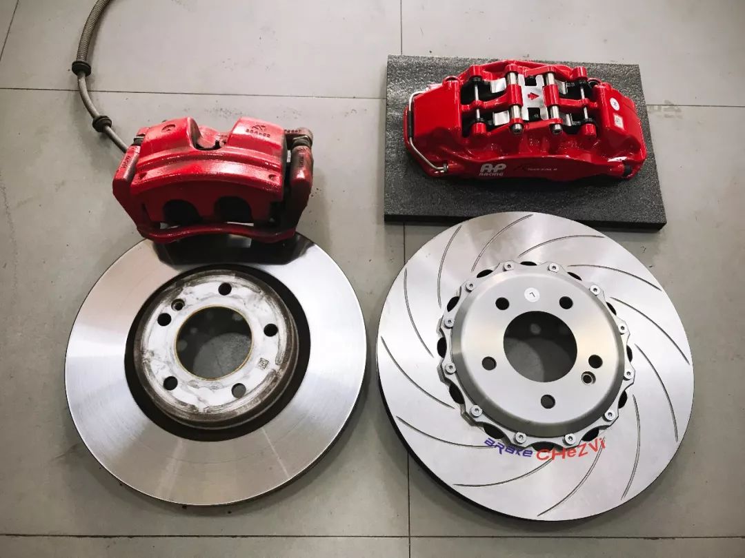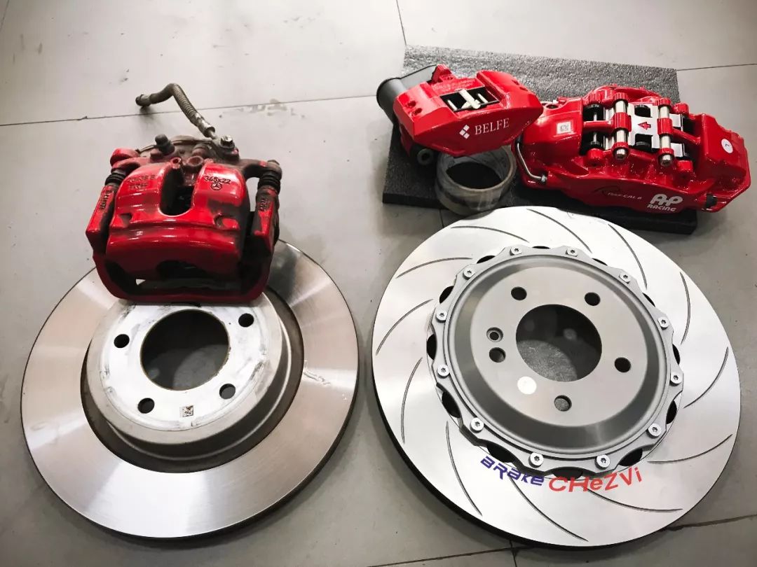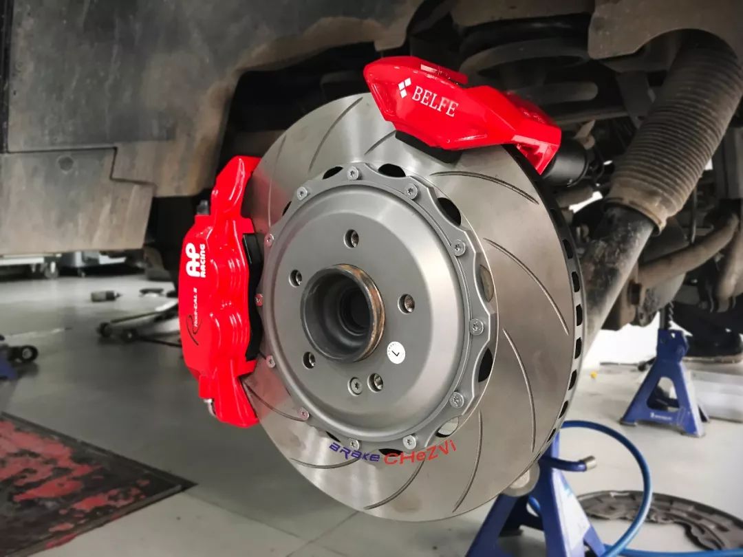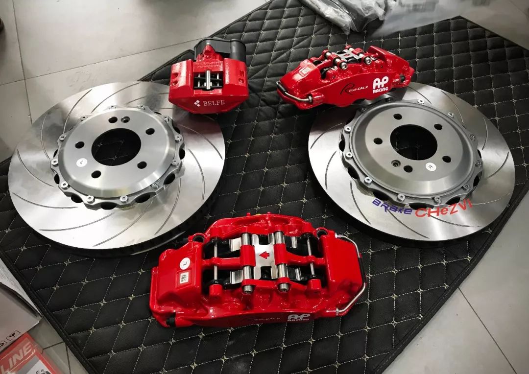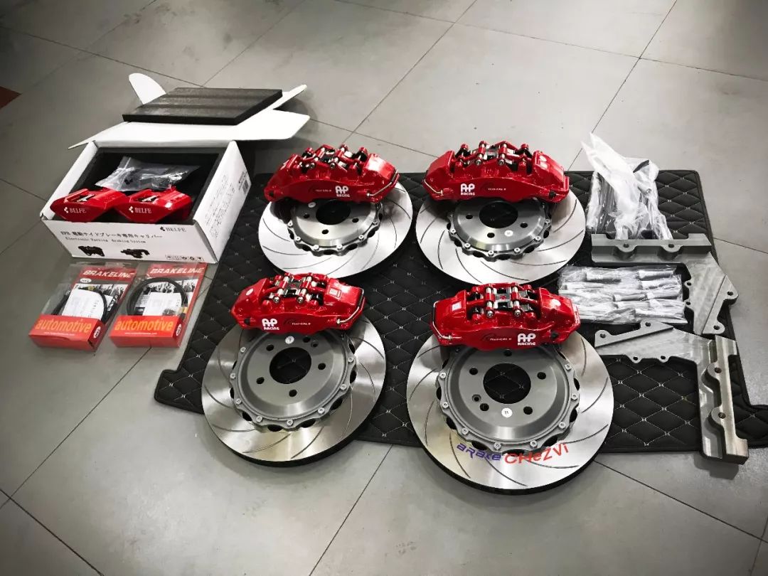 AP front six pot calipers and rear four piston calipers combine with Japanese BELFE EPB electronic hand brake calipers, would be more safe and stable, perfect solution to the problem of rear wheel electronic hand brake, appearance also has greater improvement than the original, to solve the double troubles of appearance control and performance control, more new car models of brake modification cases still under development...