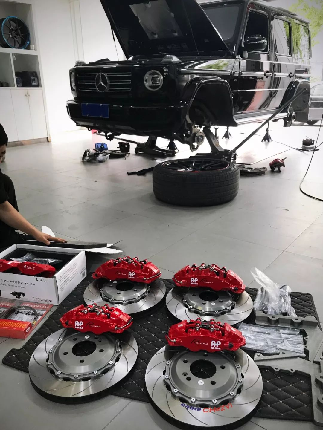 In the brake refitting, we recommend to the car owner the new CP95 series front 6 pot rear 4 pot brake kit of AP Racing with high cost performance. Because of the latest Mercedes-Benz G500 rear wheel electronic hand brake, we upgrade the rear wheel differently from the previous data. This time, we choose the double calipers case of CP95 rear four plus BELFE electronic hand brake on the braking of the rear wheel. Let's take a look at this specific case.